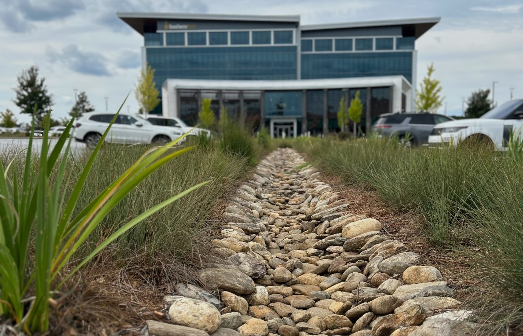 At Southern First Bank's newest location in Greenville, SC, Parris Lawn designed a plan for a functional and beautiful landscape around the bank. To do so, we: